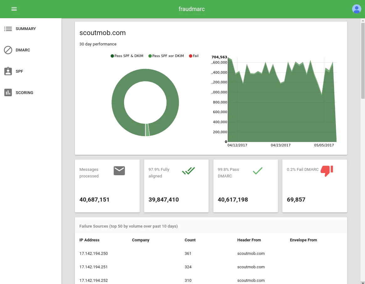 Fraudmarc primarily focuses on DMARC reporting and analysis, giving organizations the necessary visibility into their email sending. We found that its core functionality revolves around collecting DMARC aggregate reports (RUA) and presenting them in a digestible format. This allows users to identify legitimate and fraudulent email sources.